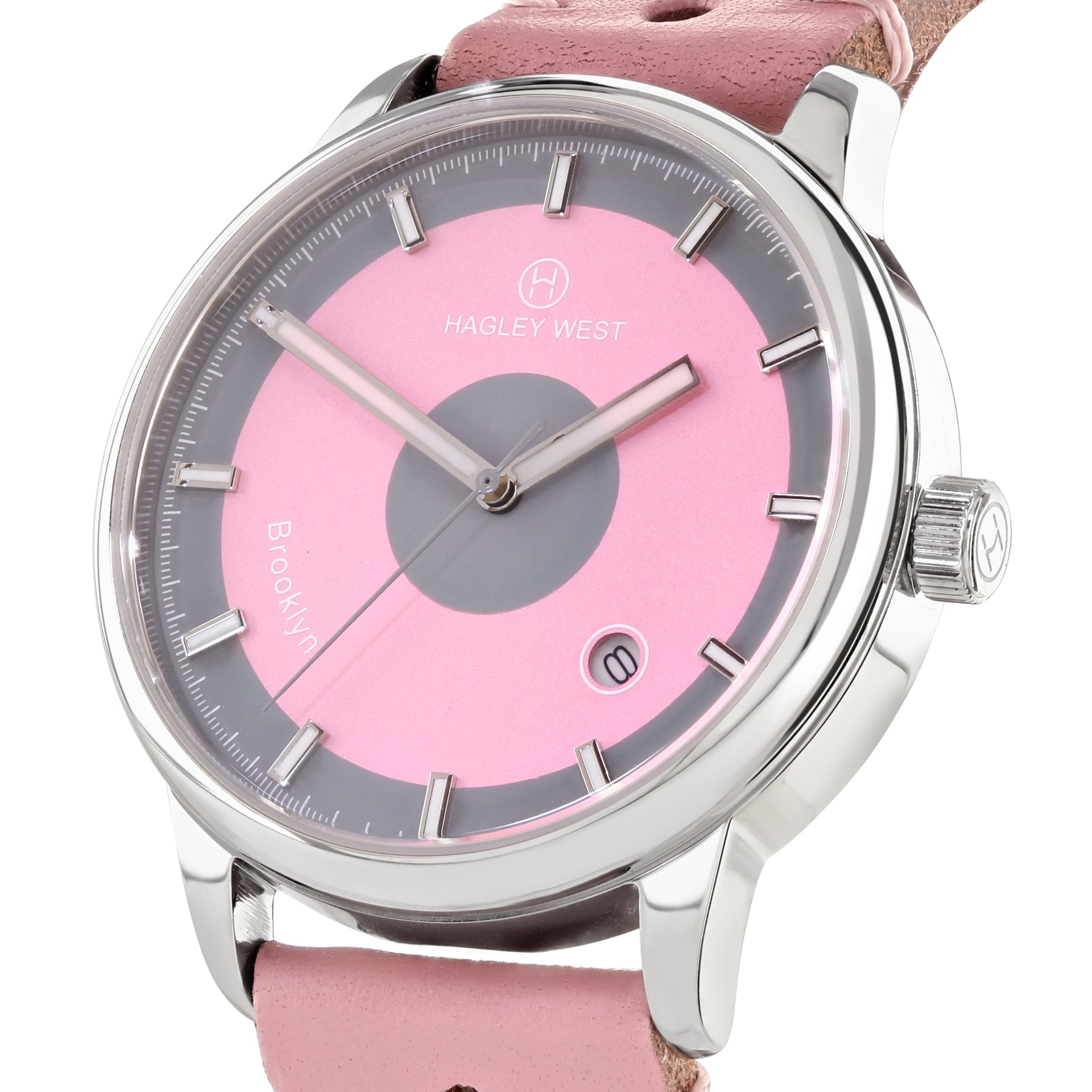 The "Bay Ridge" boasts a 36mm polished silver stainless steel case, with a pink leather strap. The contrasting pink and grey circular dial paired with the rectangular hands gives this timepiece an unapologetically sleek look to wear whatever the occasion.