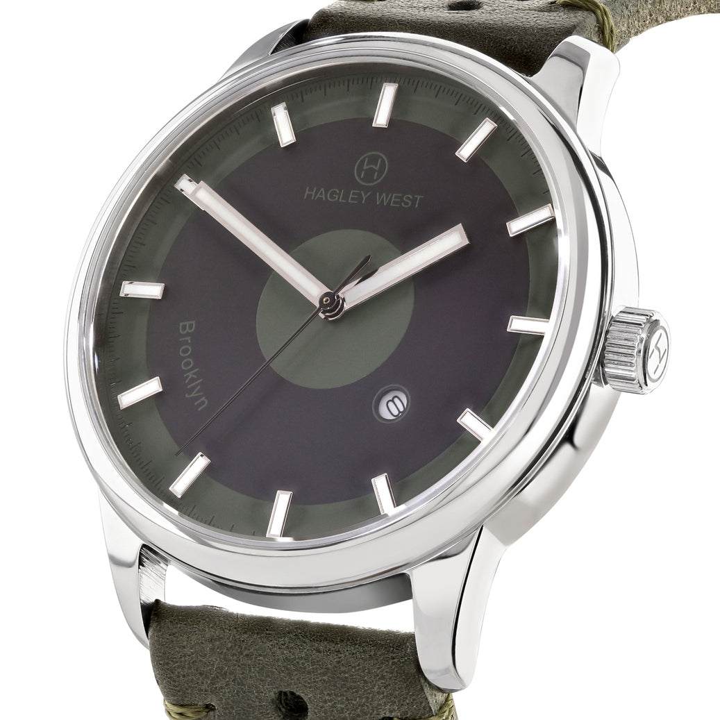 The "Green Point" boasts a 43mm polished silver stainless steel case, with a green leather strap. The contrasting green and black circular dial paired with the rectangular hands gives this timepiece an unapologetically sleek look to wear whatever the occasion.